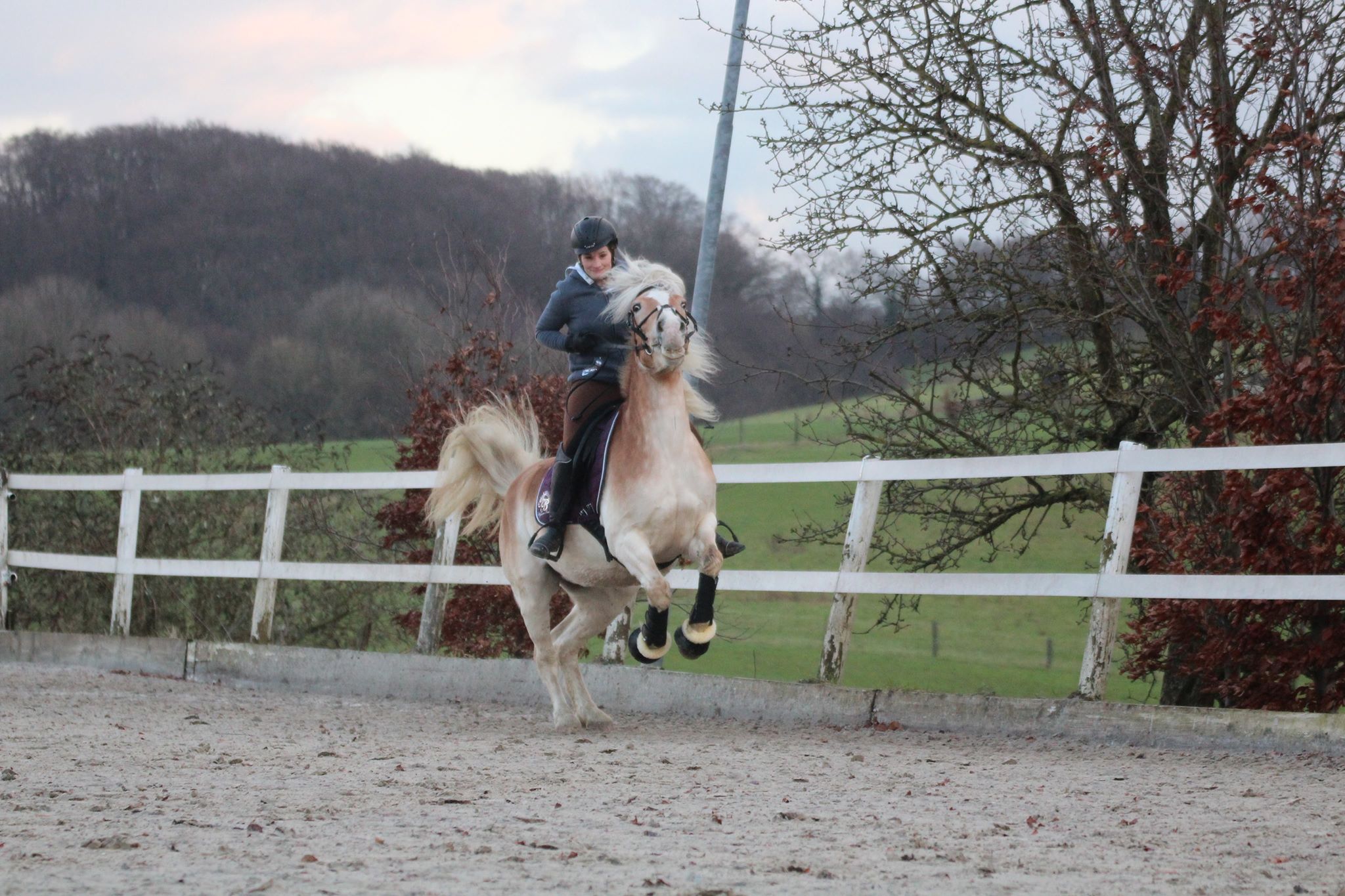 Beim Warmreiten im Schritt hat man selten Schwierigkeiten, meistens geht es wirklich erst los, wenn man nachgegurtet hat, die Abschwitzdecke weggelegt und seine Jacke ausgezogen hat. Nimmt man die Zügel auf und möchte mit der Arbeit beginnen, überlegt sich das Pony kleine Gemeinheiten. Hat man ihre kleinen Ausraster überstanden und sich durchgesetzt, kann man anschließend eine ganze Stunde ohne Faxen reiten.